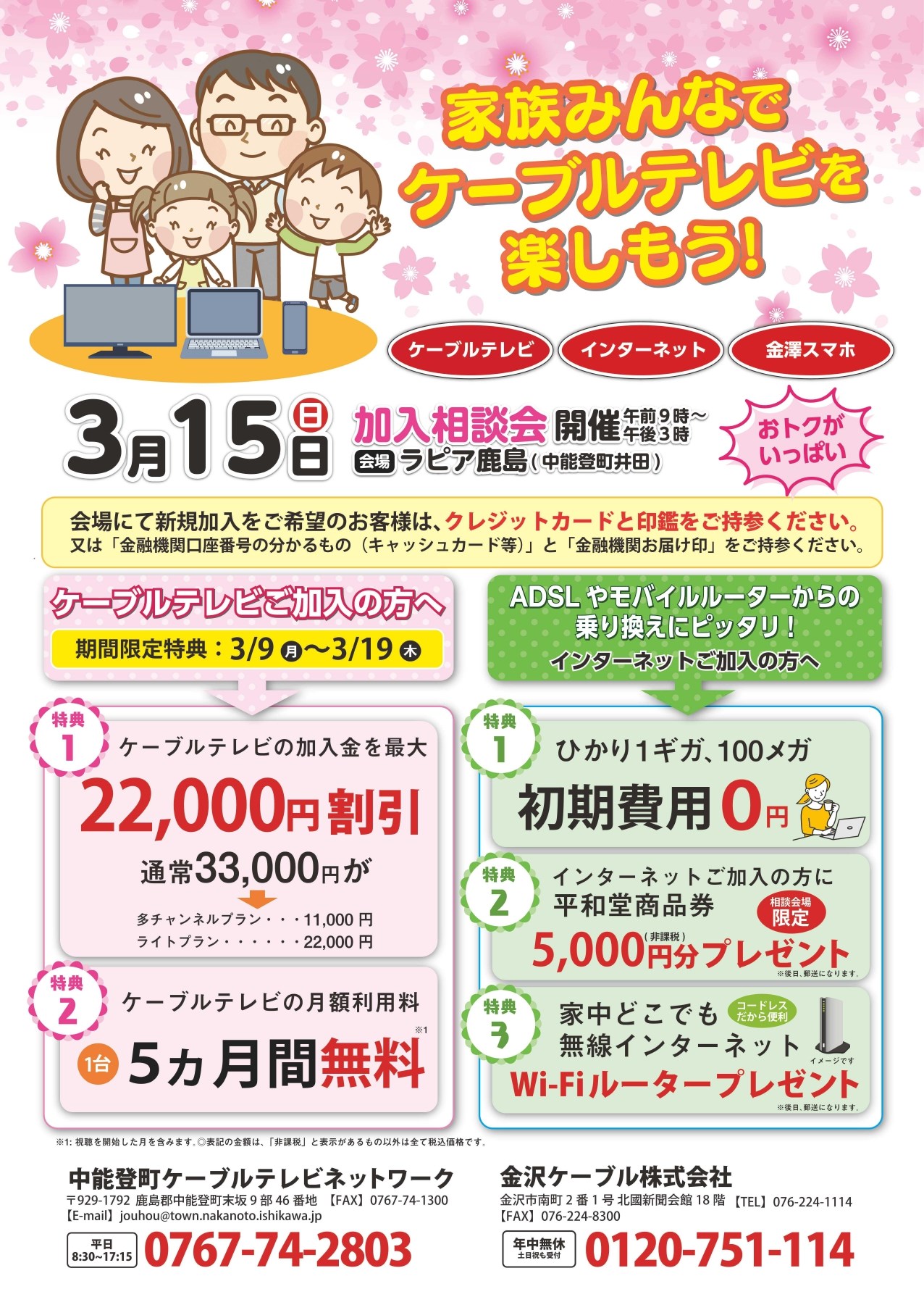 企画情報課からお知らせします。3月15日(日曜日)午前9時から午後3時まで、ラピア鹿島で「ケーブルテレビ加入相談会」を開催します。ケーブルテレビに加入をご検討されている方は是非ご来場ください。なお、金沢ケーブル株式会社によるインターネットなどの加入相談についても同時開催しています。会場限定の特典もあります。詳しくは町ホームページまたは2月26日発行の広報なかのと3月号をご覧ください。