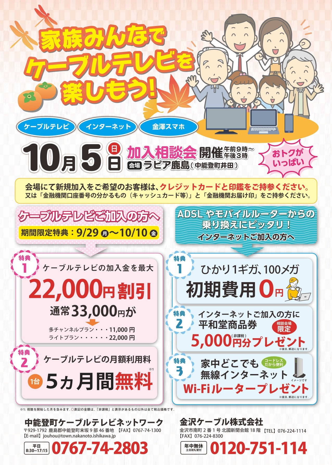 企画情報課からお知らせします。10月5日(日曜日)午前9時から午後3時まで、ラピア鹿島で「ケーブルテレビ加入相談会」を開催します。ケーブルテレビに加入をご検討されている方は是非ご来場ください。なお、金沢ケーブル株式会社によるインターネットなどの加入相談についても同時開催しています。会場限定の特典もあります。詳しくは町ホームページまたは9月25日発行の広報なかのと10月号をご覧ください。
