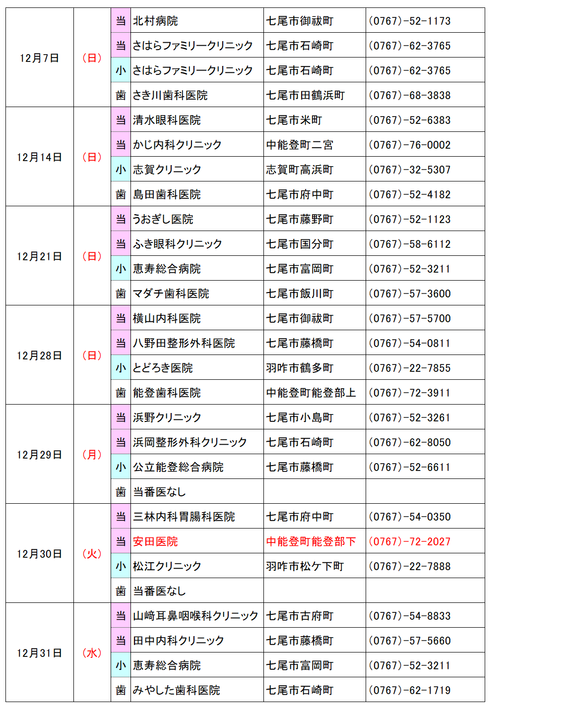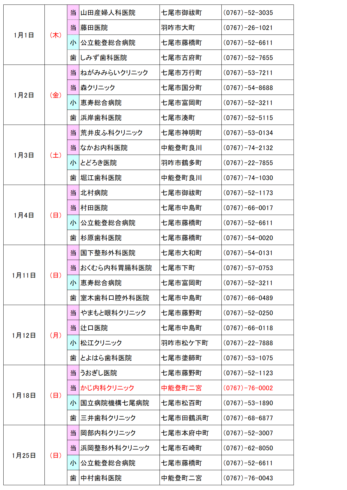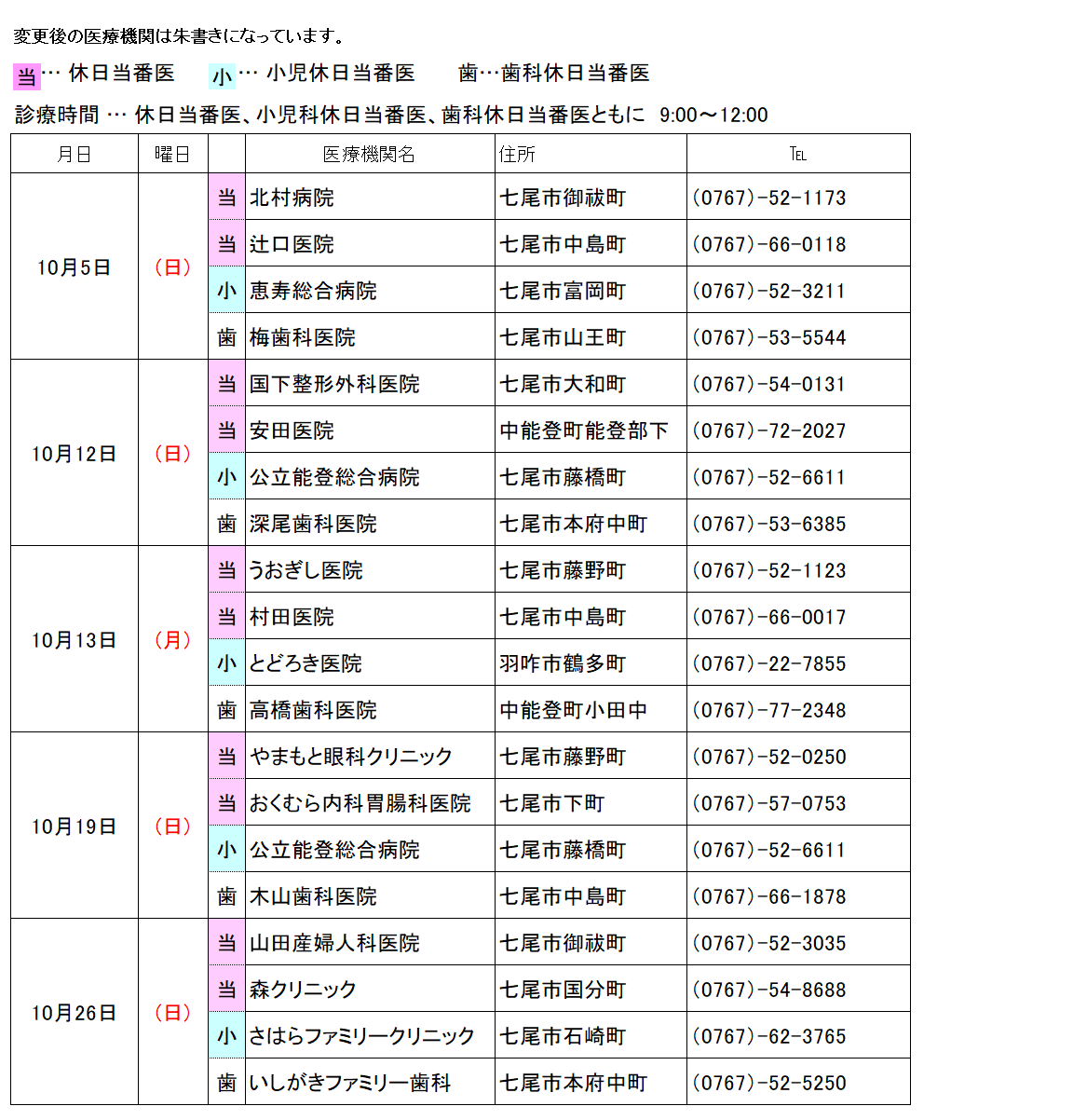 (注意)当番医が変更となる場合がありますので、受診の際には必ず電話をお願いします。