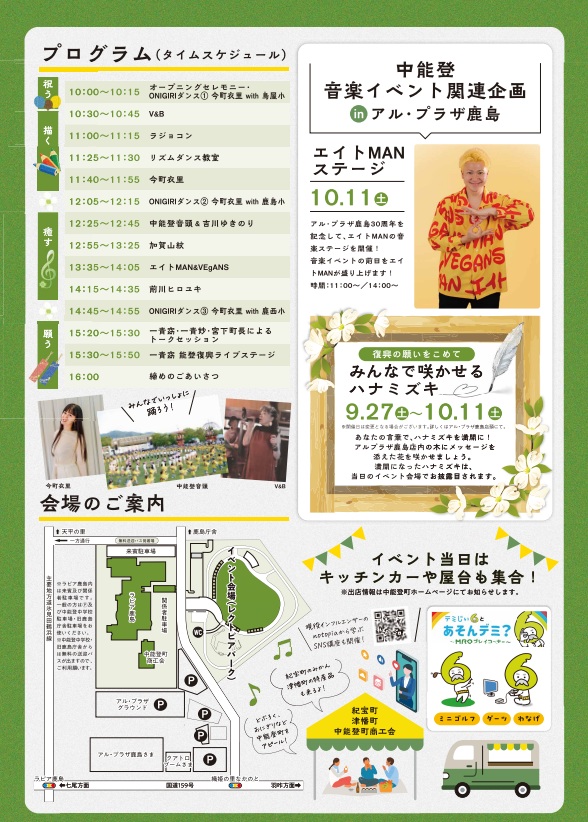 10月12日のイベントのステージなどのタイムスケジュールやアルプラザ鹿島様の関連イベントを配布しました。