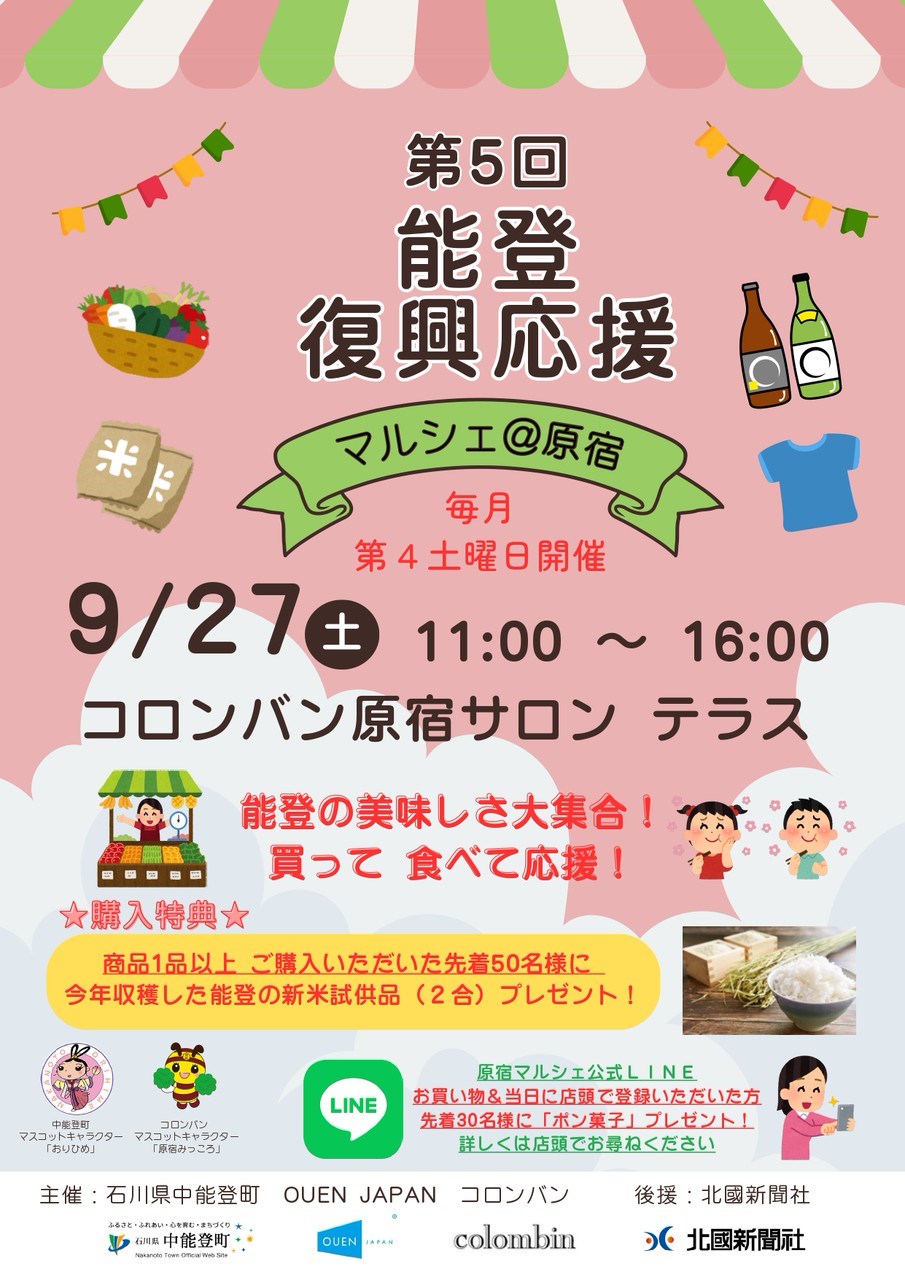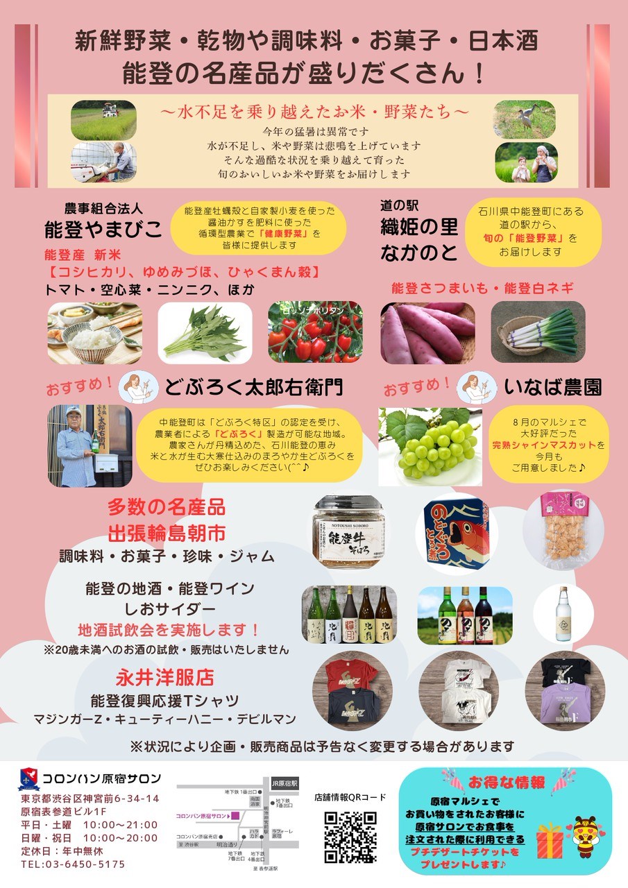 中能登町地方創生アドバイザー 小林博重様(中能登町出身、現特定非営利活動法人OUEN Japan理事長)の尽力により、東京原宿の老舗洋菓子店コロンバン様と連携して、能登復興のマルシェを実施しております。中能登町の魅力をはじめ能登復興に向けてたくさんの方に応援いただくために地元の農家や団体と連携して進めております。ぜひお近くまでお越しの際は、お立ち寄り願います。